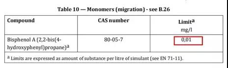 雙酚A的遷移量限值下調(diào)至0.01mg/L,為原來(lái)限制的1/12.5