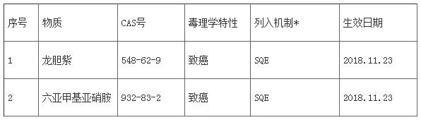 2018年11月23日,美國加州環(huán)境健康危害評估環(huán)保辦公室(OEHHA)發(fā)布公告,正式將“龍膽紫和六亞甲基亞硝胺”添加到加州65有毒有害化學物質(zhì)清單中。