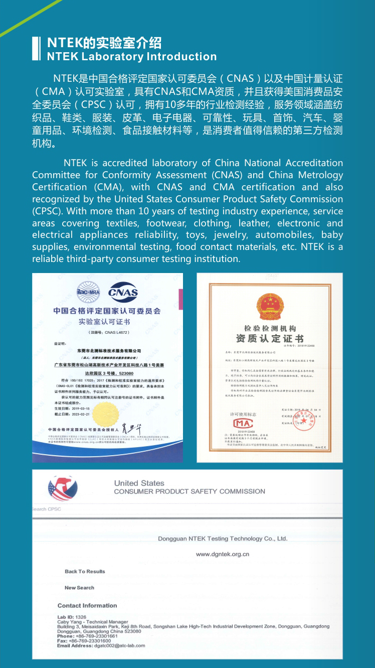 北測標準作為國家CMA和CNAS授權認可的檢測機構,一直致力于為客戶提供更好的檢測認證服務。經多年的發展與壯大,北測標準已建立包括但不限于紡織品、鞋類產品、皮革、電子電器、食品接觸材料、玩具等產品的檢測實驗室,可為您提供全方位的產品檢測服務及相應的解決方案。