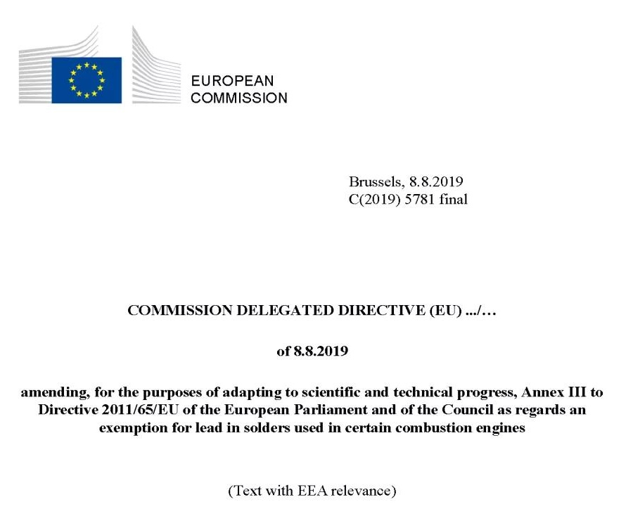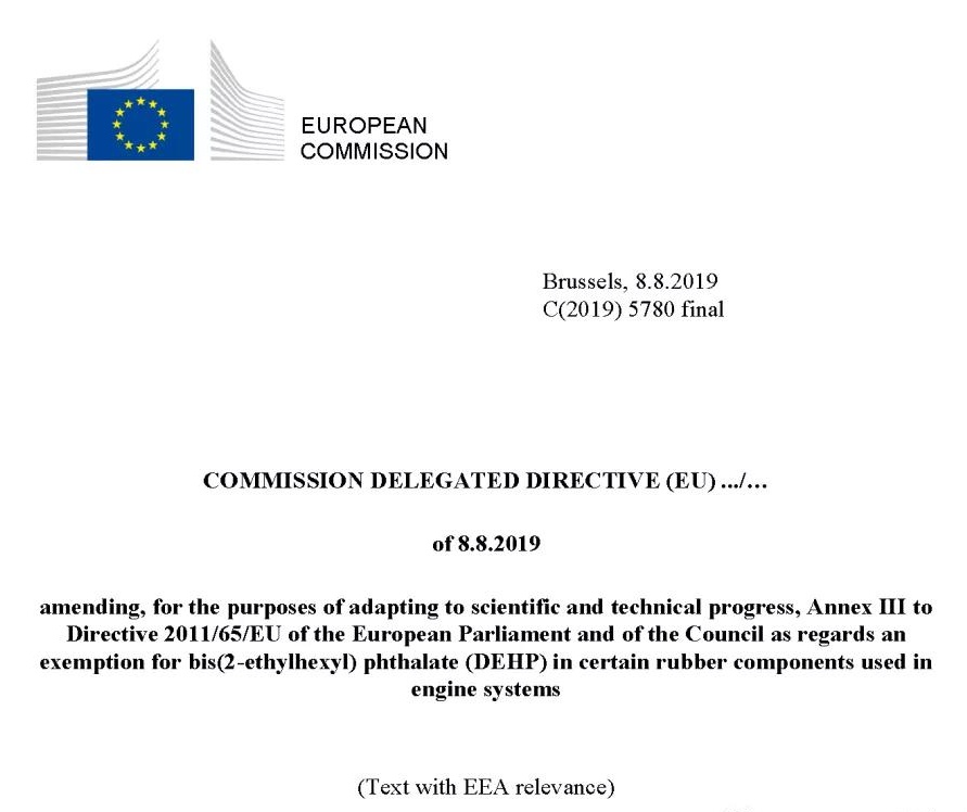 2019年8月8日,歐盟委員會通過了兩個Pack 14授權的指令,這些指令對歐盟指令2011/65/EU的附件III進行了修訂,該指令涉及“限制在電氣和電子設備中使用某些有害物質”。該指令將于其在《歐盟官方雜志》上發布后的第20天生效。