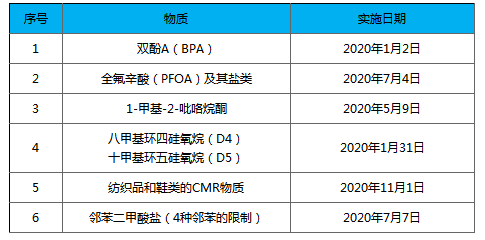 歐盟REACH法規(guī)附錄17中的一些物質(zhì)的限制將于明年開始實(shí)施,具體受限制的物質(zhì)為雙酚A、全氟辛酸及其鹽類、1-甲基-2- 吡咯烷酮、八甲基環(huán)四硅氮烷、十甲基環(huán)五硅氧烷、紡織品及鞋類里的CMR物質(zhì)、領(lǐng)苯二甲酸鹽(4種鄰苯),具體如下圖所示: